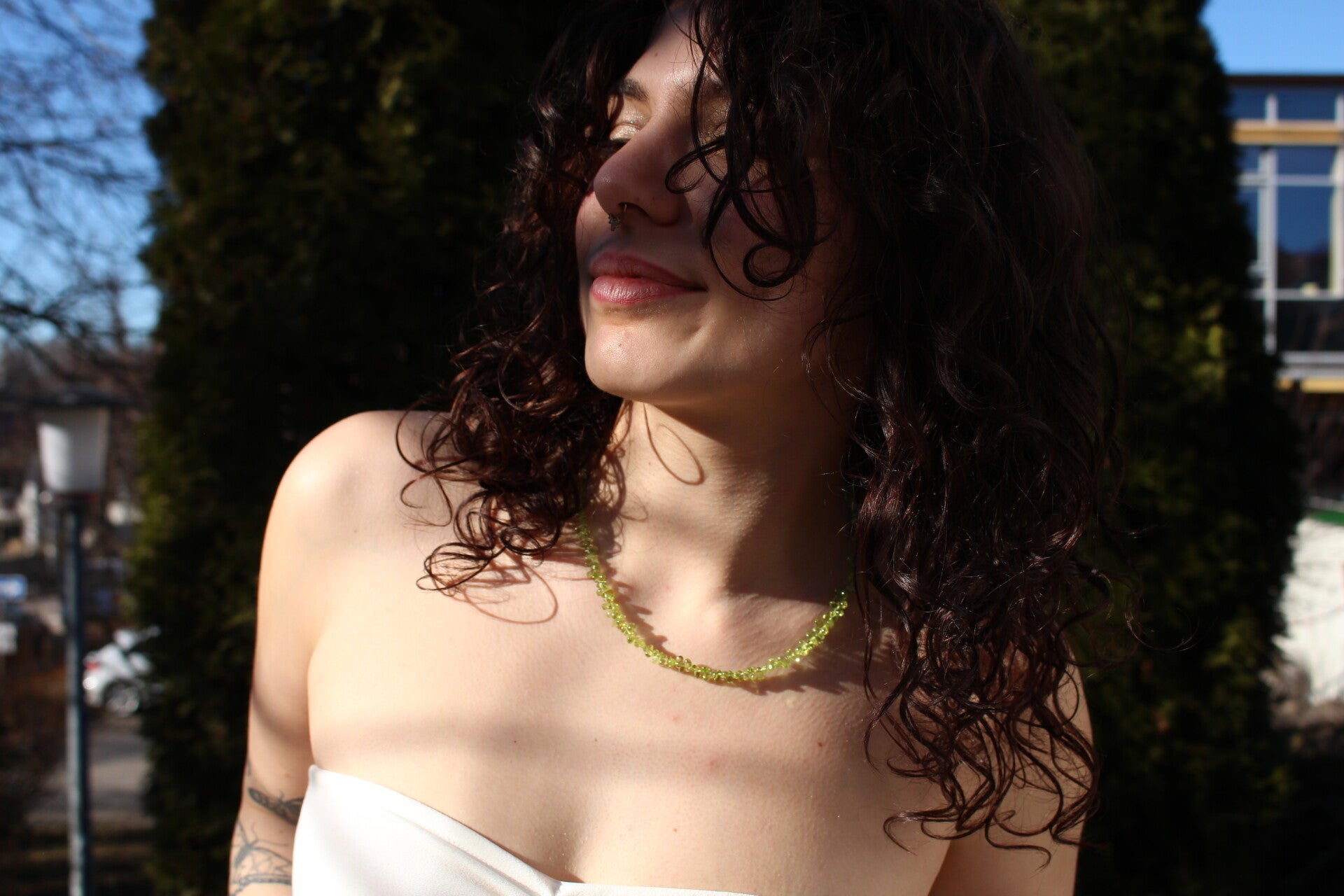 Feine Peridot Tropfen Halskette mit Steingröße ca. 5–7 mm. Das klare, lebendige Grün setzt einen frischen Akzent und bringt Natürlichkeit in jedes Outfit.