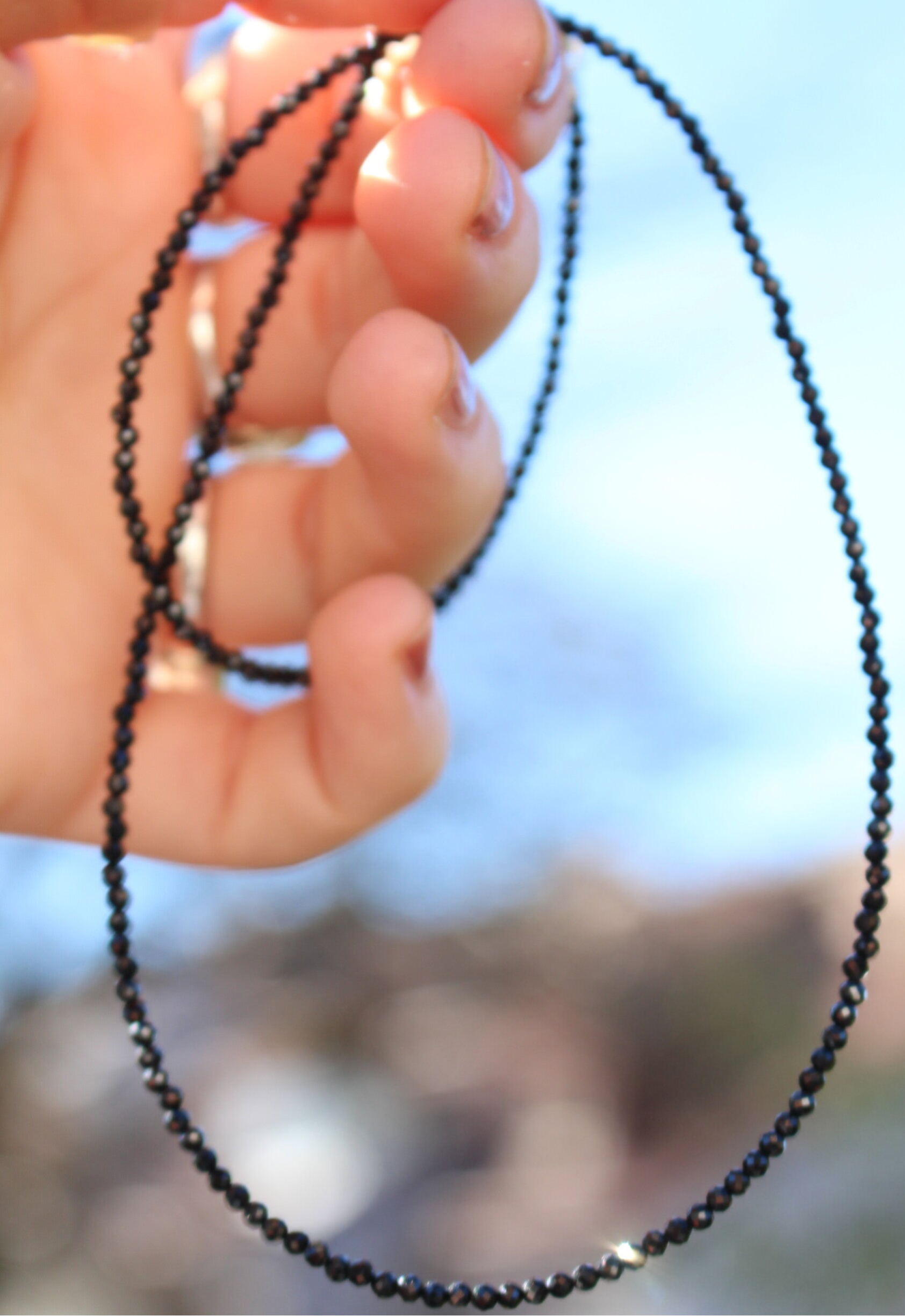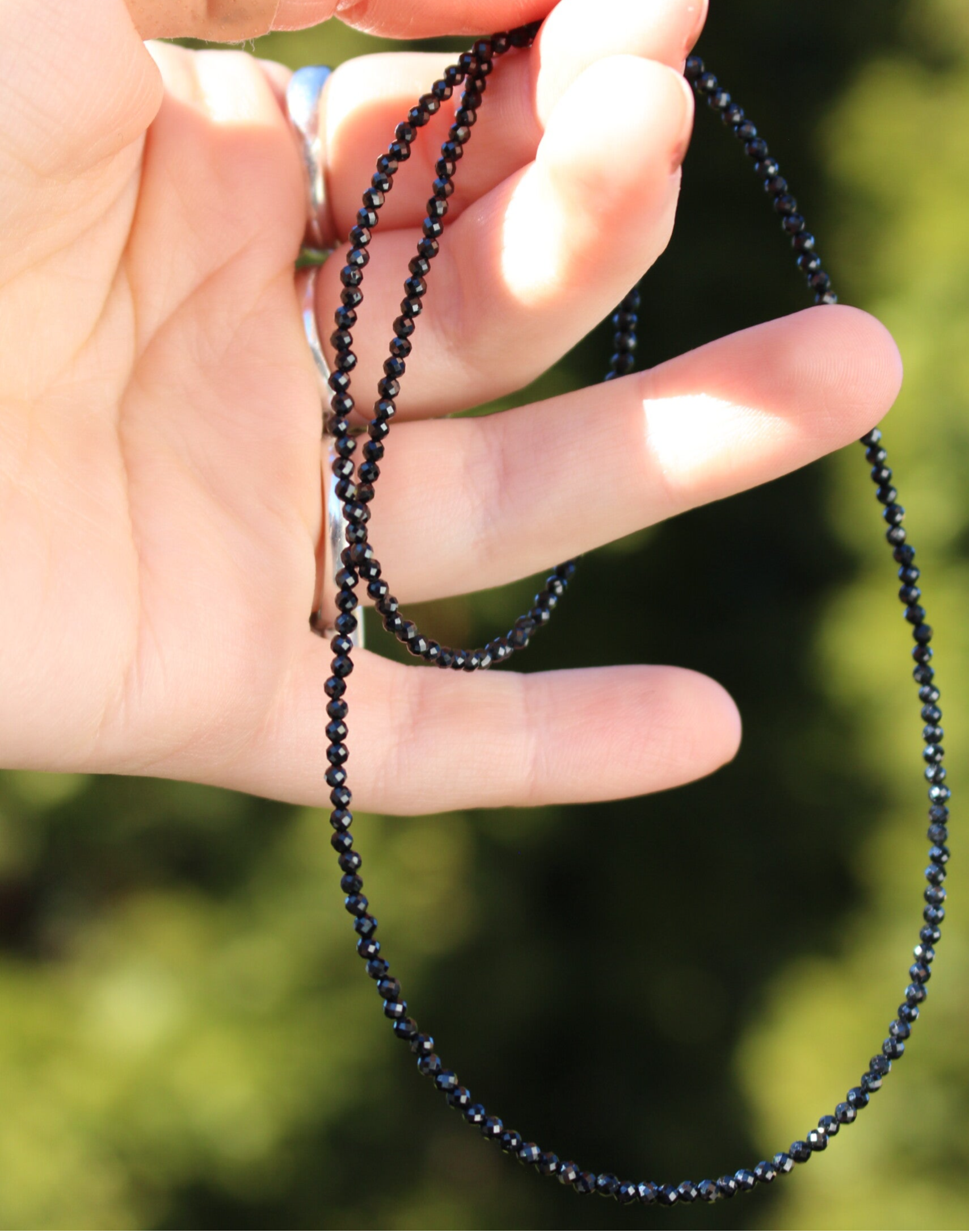 Filigrane Spinell Kugelkette mit facettierten 2 mm Steinen in intensivem Schwarz. Dezent, elegant und gleichzeitig ausdrucksstark.
