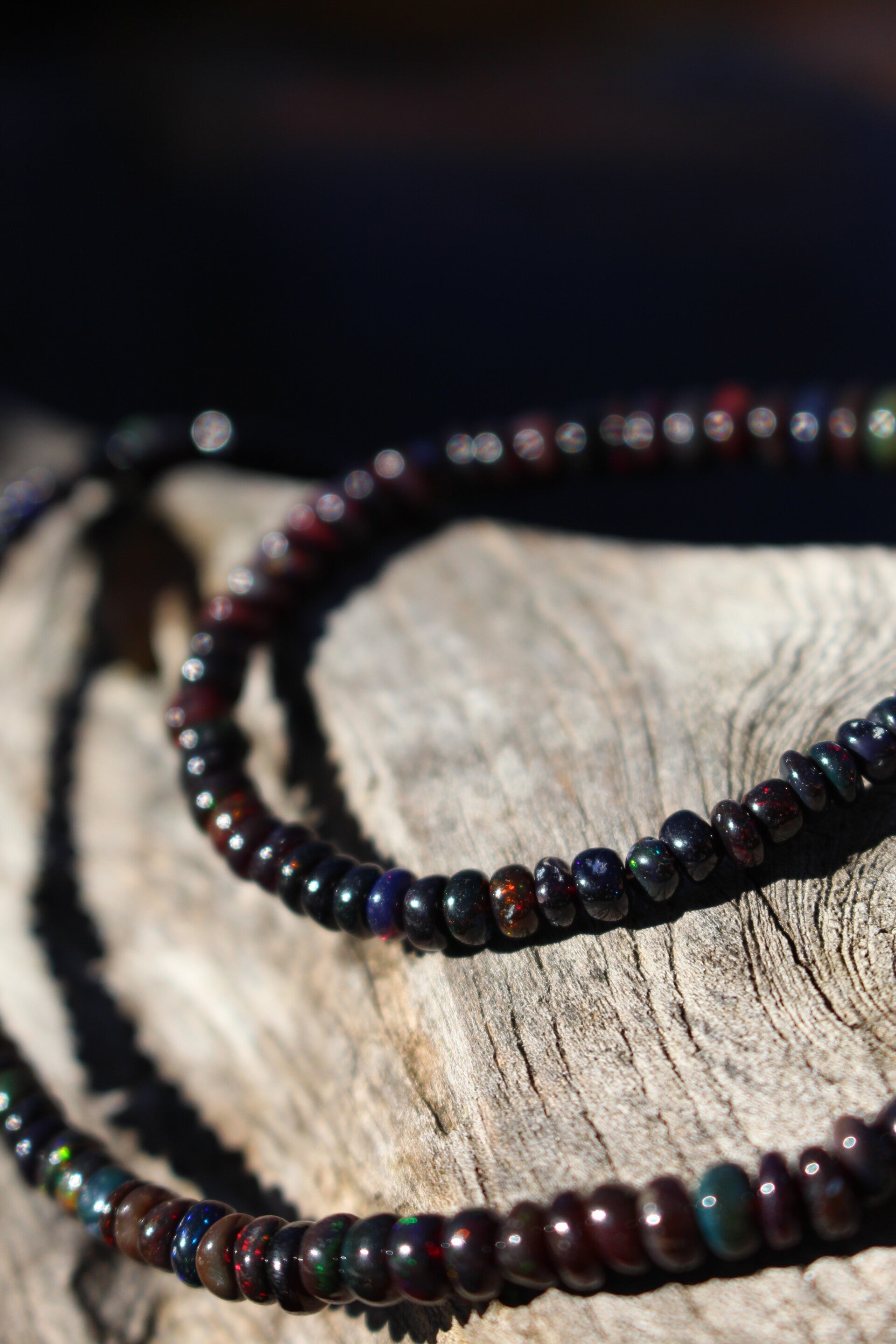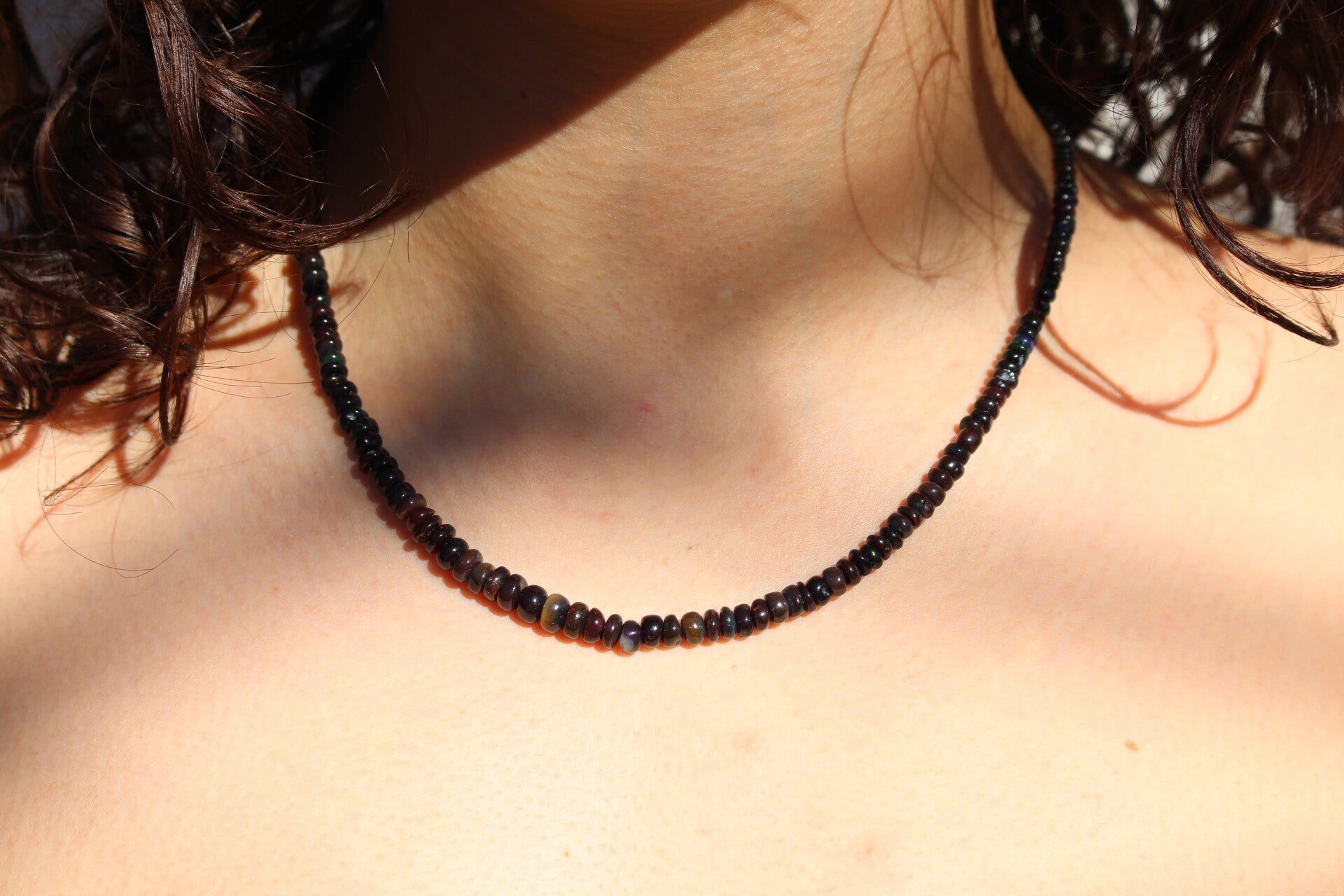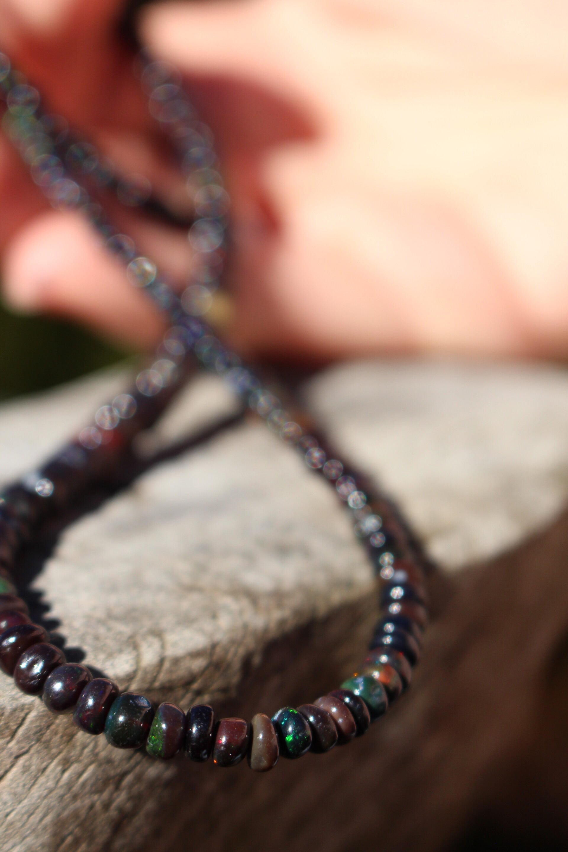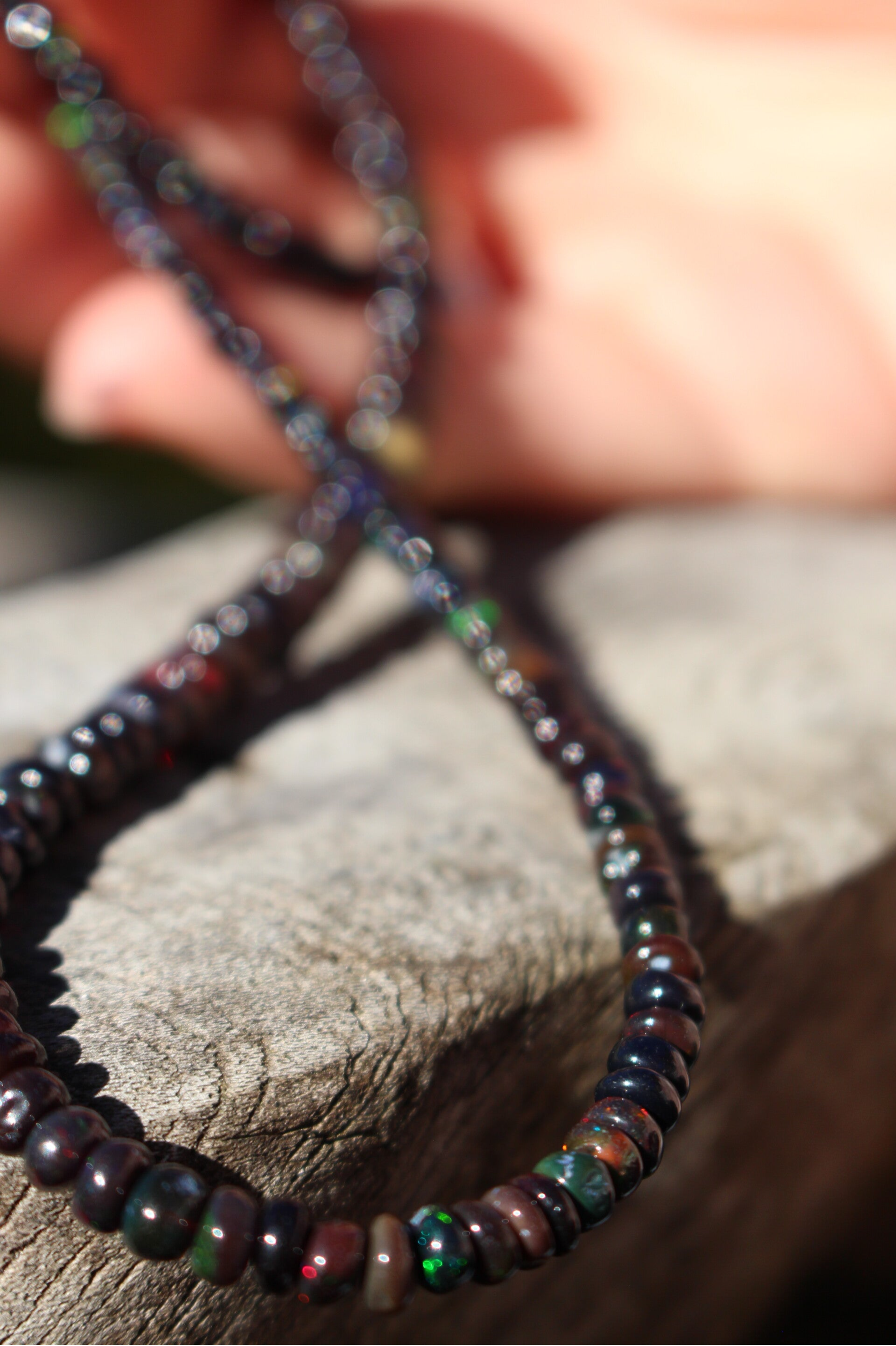 Elegante Schwarzer Opal Buttonkette mit faszinierendem Farbspiel. Die dunkle Grundfarbe bringt die schillernden Lichtreflexe in Blau-, Grün- und Rottönen besonders intensiv zur Geltung. Durch die feine Buttonform wirkt die Kette zugleich edel und natürlich.